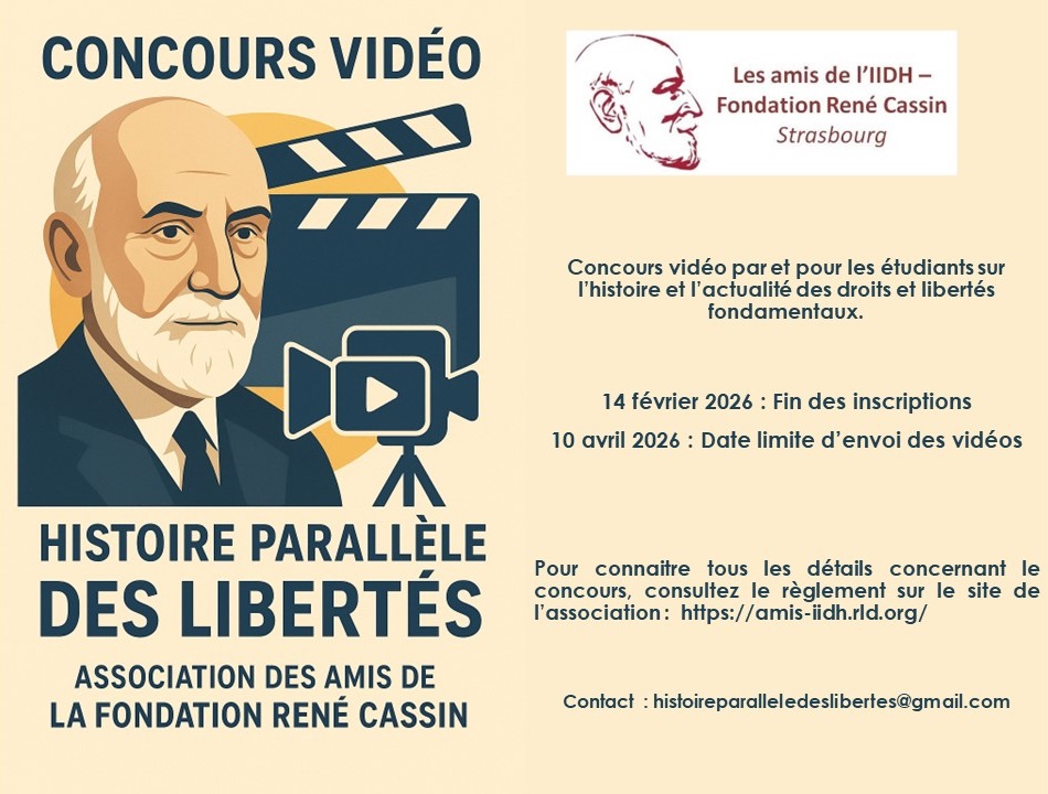 L’Association des Amis de la Fondation René Cassin organise un Concours vidéo « Histoire parallèle des libertés ». Ce concours vous invite à créer une vidéo mettant en rapport un événement historique marquant pour la protection des droits fondamentaux et leur actualité.